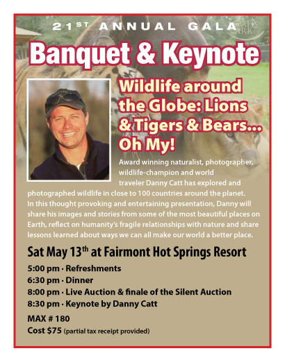 We were honoured that Danny Catt was the the Keynote Speaker at the Gala on Saturday May 13. Danny is an internationally known conservationist, photographer and environmental educator. He spent more than decade in the upper Columbia Valley as a park planner when he received a Rotary International ‘Preserve Planet Earth’ scholarship to study conservation around the globe. Since then, Danny has explored and photographed the people, landscapes and wildlife of close to 100 countries. Now head of British Columbia Institute of Technology’s Fish, Wildlife and Recreational Land Management program he inspires future generations of wildlife conservationists.